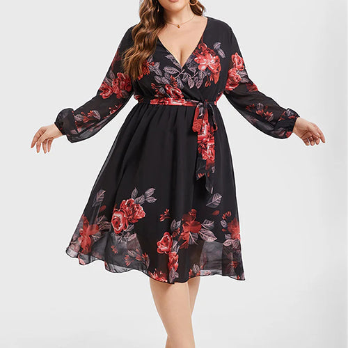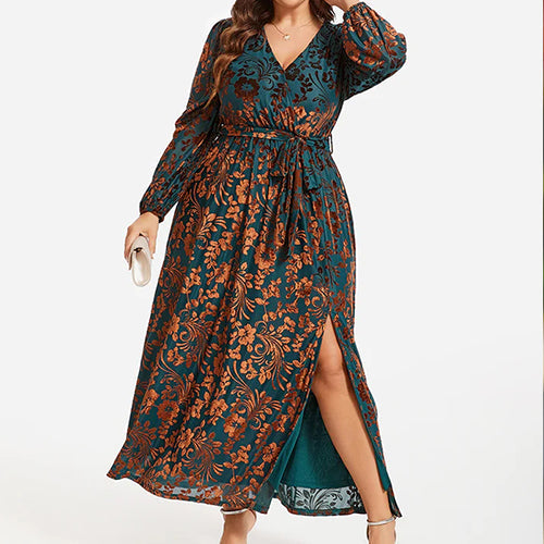 VIP Floral Print Wrap Belted Velvet Dress with Pockets