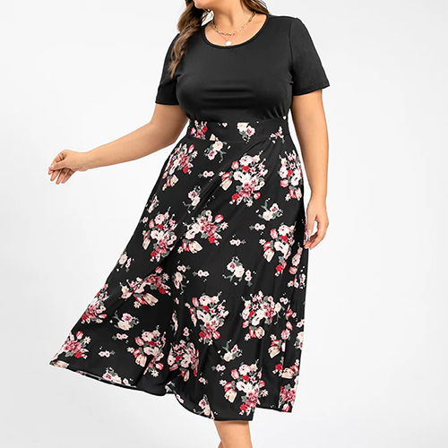 Plus Black Floral Square Neck Puff Sleeve Midi Dress