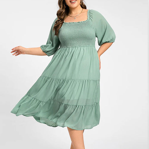 Plus Green Ruffle Sleeve Elastic Waist Midi Dress